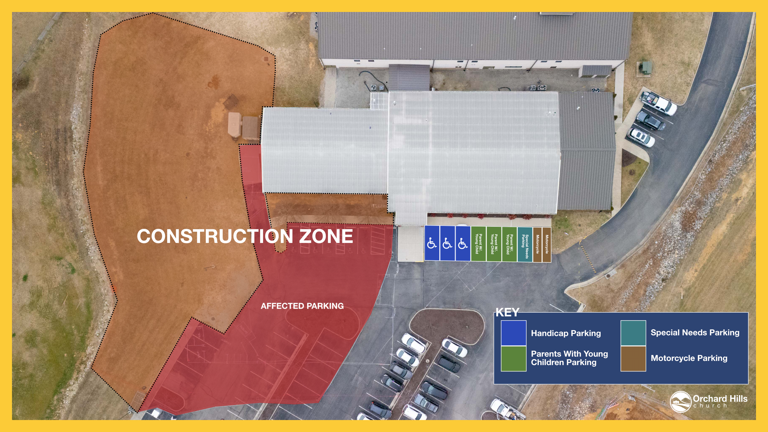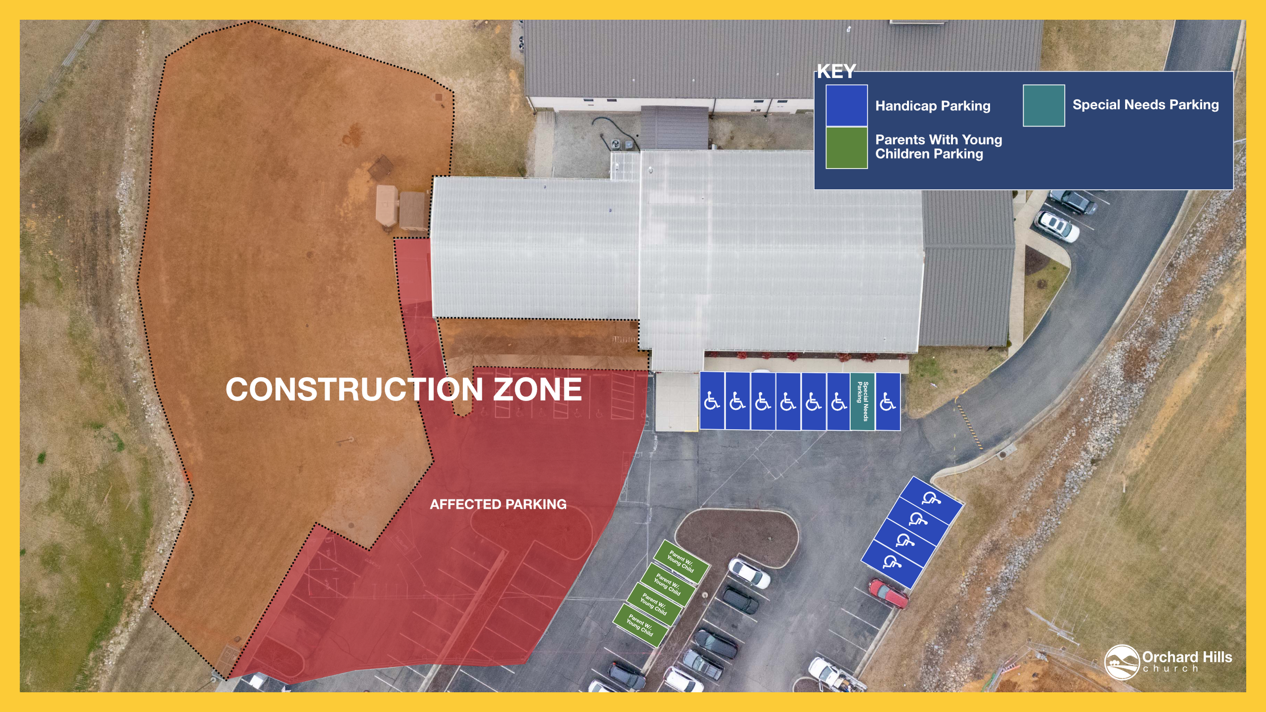 As we begin construction on phase two of our facility expansion, we will be adapting to the construction zone in-front of and to the side of our building. Please view this map of the current closure and changes in handicap and parents with young children parking. We will update changes in operation as they continue to change