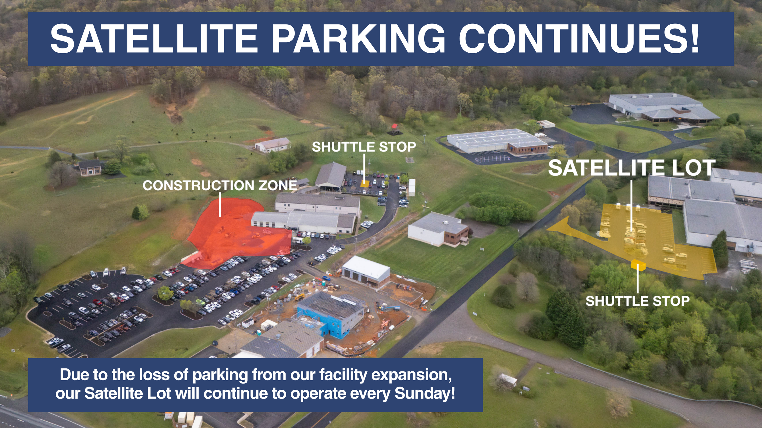 Due to the continued loss of parking spaces in our main parking lot, we are continuing Satellite Parking operations. There will still be a shuttle bus running before and after service, taking people to and from the satellite lot and the pavilion. We have also installed a bridge over the ditch, making it easier to walk from the satellite lot to the church if you choose to do so.