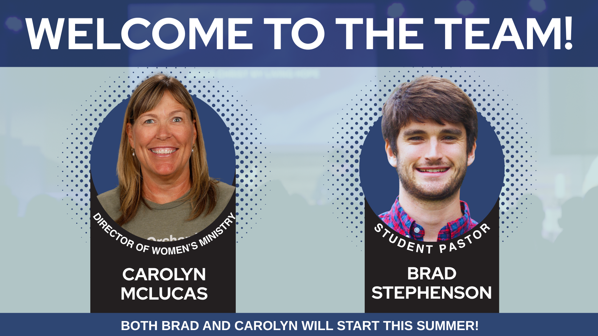 We are excited to announce our new hires, Carolyn McLucas and Brad Stephenson. Carolyn will be our Director of Women’s Ministry and Brad will be our new Student Pastor. Both will begin this summer in these positions. We are excited for these new additions to our team!