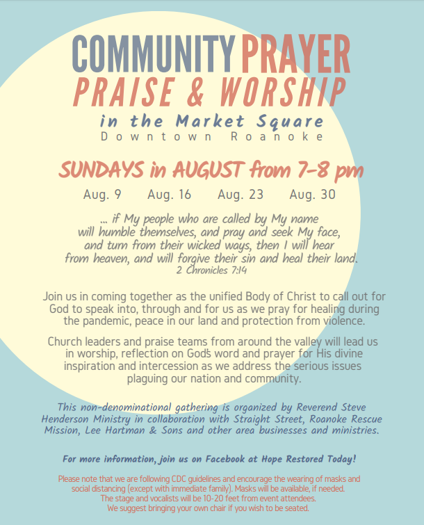 Community Prayer, Praise and Worship Sunday, August 9, 2020 7:00 PM 8:00 PM 19:00 20:00 Google Calendar ICS Join us downtown in the Market Square the last four Sunday nights in August as we pray and sing with believers from all over the Valley and ask the Lord to heal our land.