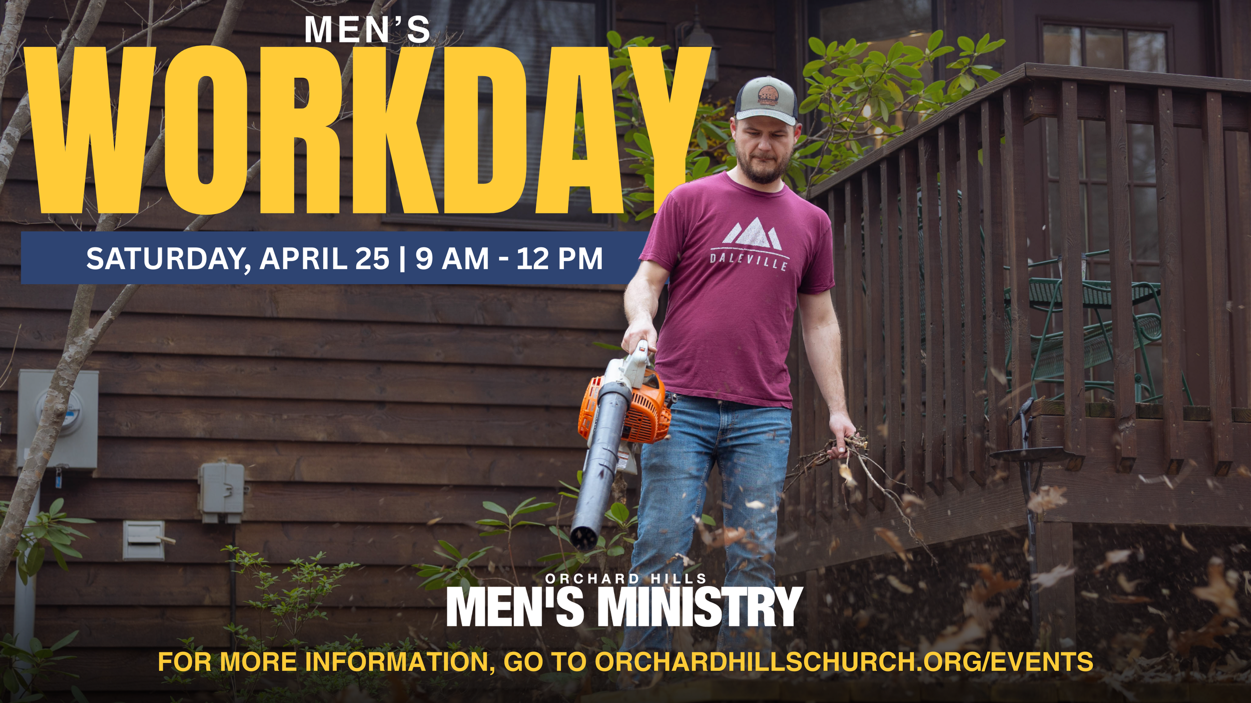 Join us for our Men's Breakfast and Workday on April 25th! We'll start with breakfast in the Garage from 8 am to 9 am, and then head out to serve our community from 9 am to noon. This event is a great opportunity for the men of Orchard Hills to come together, connect, and give back to our community. We'll be serving in various ways, and we'd love for you to join us. Invite a friend and sign up to serve - let's make a difference together!