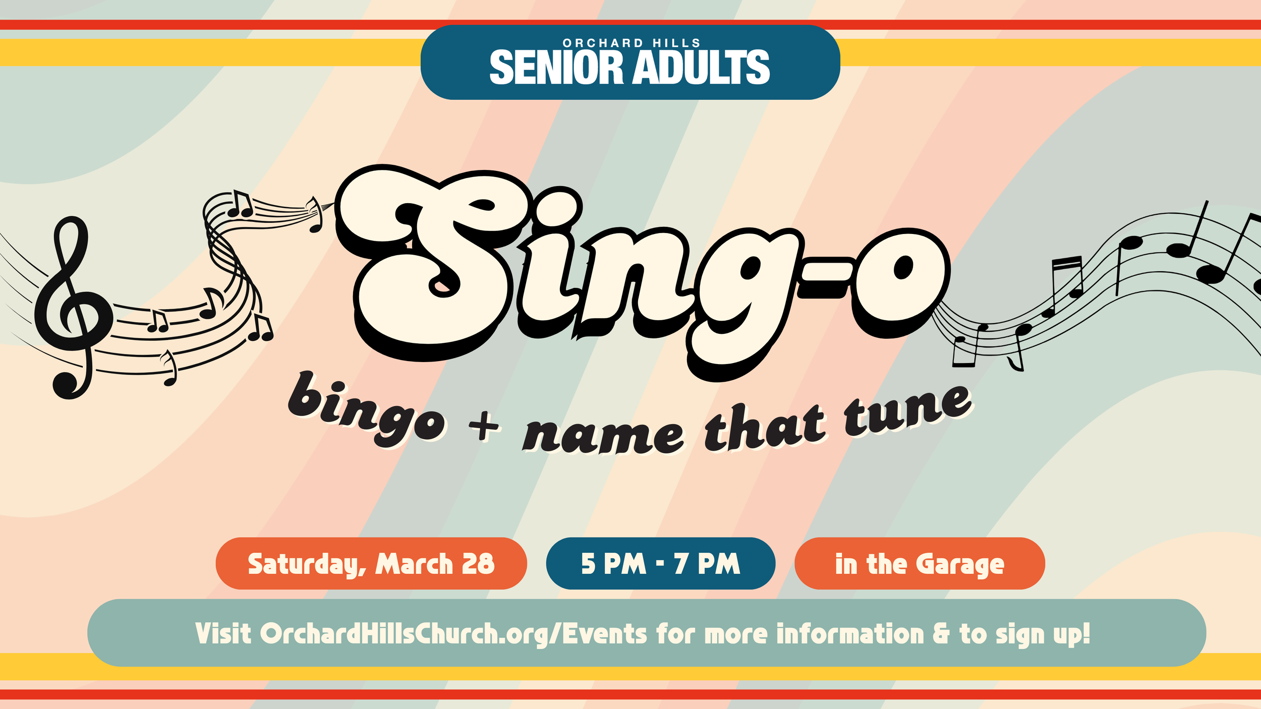 Get ready for a blast from the past at Sing-O event, where bingo meets name that tune! On Saturday, March 28th from 5:00-7:00 PM in the Garage, senior adults and friends can enjoy a fun evening of 60's and 70's music, pizza, and dessert - all while playing along to the tunes they love. To secure your spot, simply call or text 540-293-8713 to RSVP and invite a friend to join in on the groovy fun!