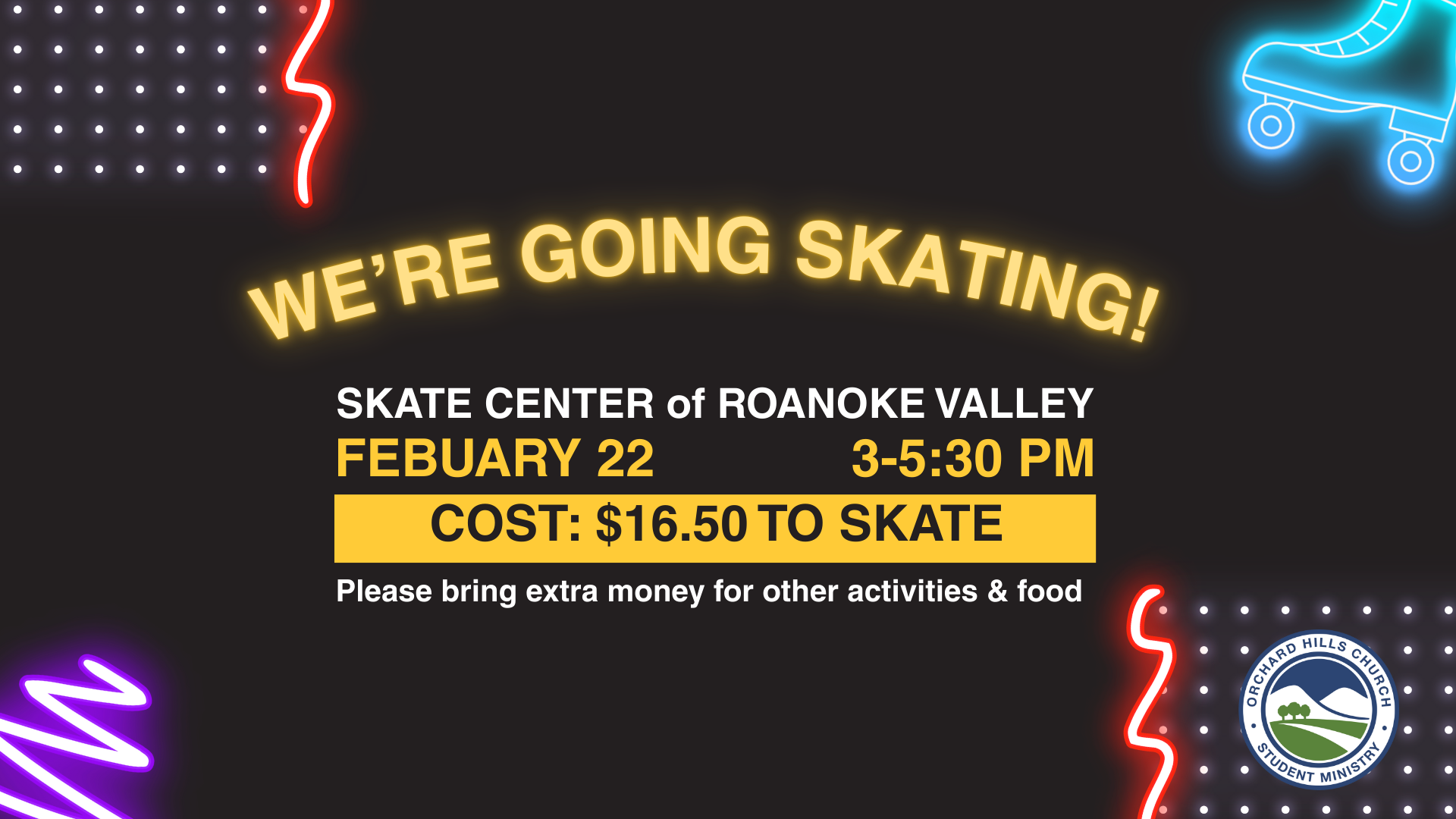 Students Skating Afternoon - a fun event for middle and high school students and youth ministry volunteers. Join us at the Skate Center of Roanoke Valley on February 22nd from 3-5:30 PM for an afternoon of skating, friends, and unforgettable memories. The cost to skate is $16.50, but feel free to bring some extra cash for snacks and activities. We're excited to invest in the lives of our students and build relationships that will last a lifetime.